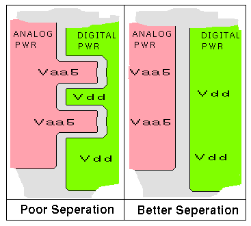 | Currents in either power plane can couple NOISE to the other; the coupling mechanism is mostly magnetic. |