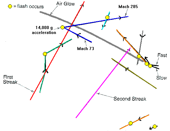 A glowing object suddenly appeared just below the horizon and "slowly" moved from right to left and slightly upward in the picture. Several other glowing objects had been visible before this, and had been moving in various directions. Then a flash of light occurred at the lower left of the screen; and the main object, along with the others, changed direction and accelerated away sharply, as if in response to the flash. Shortly thereafter a streak of light moved through the region vacated by the main object, and then another streak moved through the right of the screen, where two of the other objects had been. Roughly 65 seconds after the main flash, the TV camera rotated down, showing a fuzzy picture of the side of the cargo bay. It then refocused, turned toward the front of the cargo bay, and stopped broadcasting. |