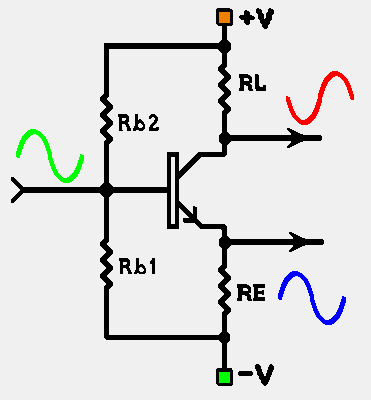 collector, and simultaneously, a smaller, non-inverted output at the (shared)