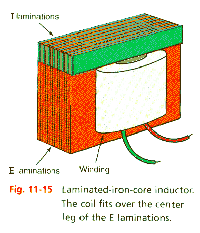 | The power supply is often the part of the equipment which converts alternating to direct current. The filter circuit, which includes the ininductor, smooths out the fluctuating or pulsating direct current until it is nearly pure direct current. There are two types of filler chokes: the smoothing choke and the swinging choke. The swinging choke is one in which the I and E laminates are butted together so that there is a minimum air gap between them. This makes the amount of inductance vary with the amount of current. A typical swinging choke may be rated 20 H at 50 mA and 5 H at 200 ma. The smoothing choke frequently has a small (0.1 mm air gap between the I and E laminates. This makes the inductance less dependent on the amount of current because air does not saturate as easily as iron. | ||||||||||||||||||||||||||||||||||||||||||||||||||||||||||||||